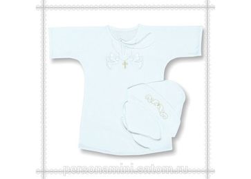 Комплект : крестильная рубашка и нарядный чепчик. Украшен тематической вышивкой. Размер 40. Уточнить наличие и заказать можно на сайте http://www.personamini.ru/yaselnyiy-assortiment/premium-klass