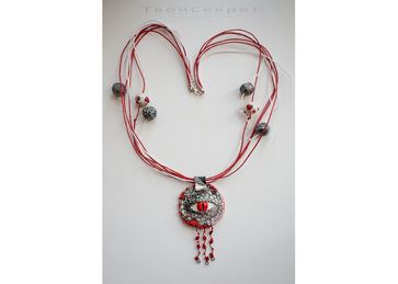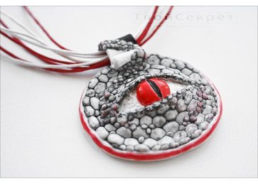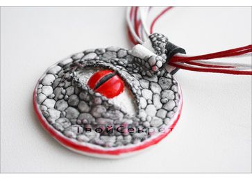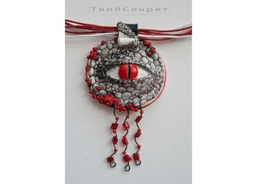 Уникальное космогонистическое колье ручной работы! Центральный элемент изображает глаз дракона (или змеи). Контрастные и привлекающие внимание цвета - черный, белый, красный. Вы не останетесь незамеченной!
