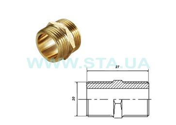 Ниппель равносторонний латунный 20мм ГОСТ 8958-75 - резьбовая деталь трубопровода, которая используется для соединения труб одного диаметра с внутренними резьбами и представляет собой цилиндр из латуни с наружными резьбами и гайкой для вращения между ними - больше товаров на нашем сайте www.sta.ua