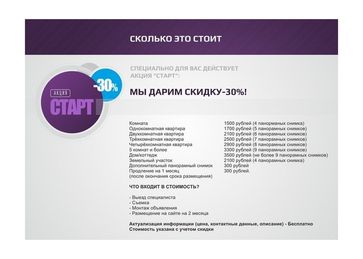 В цену входит: выезд специалиста + фотосъемка + монтаж объявления + размещение на нашей интернет площадке + размещение объявления и приложения в группе VK