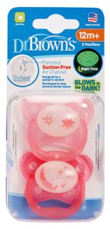 Пустышки Dr.Brown’s PreVent ночные 12 Звездочки/месяц розовые 2 шт. изготовлены согласно уникальной запатентованной технологии и имеют воздушный канал, благодаря которому снижается давление на небо при сосании и предотвращается возникновение проблем с прикусом. Силиконовая часть соски - мягкая, имеет удобную грушевидную форму и тонкое основание, что создает комфортные для малыша условия. Минимальная сумма заказа 1500 руб. Возможен самовывоз. Есть доставка.