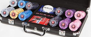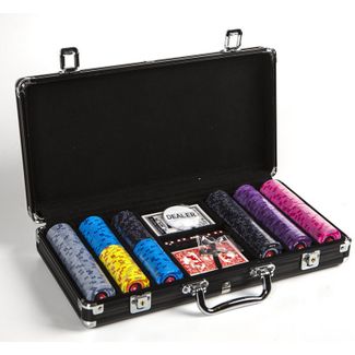 Наличие 300 фишек позволит одновременно принимать участие до 7 человек и у каждого будет неплохой «банк». Они выполнены из керамики, что гарантирует долгий срок службы, а держать их в руке – одно удовольствие. Вес каждой фишки составляет 10 грамм, что является золотой серединой среди всех, представленных в нашем магазине.