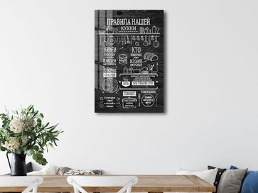 Картина Правила нашей кухни — стильный декор, который подчеркнет непринужденность обстановки. Гладкая поверхность стекла легко очищается от любых загрязнений и защищает изображение от влаги и выгорания. Модель дополнена металлическим креплением и дюбель-крючком, с помощью которых крепится на стену.<br>