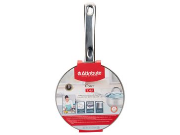 Ковш Grace 1,4 л выполнен из долговечной нержавеющей стали. Гладкая поверхность моется легко и быстро, поэтому модель всегда остается гигиеничной и надолго сохраняет безупречный внешний вид.<br> Прозрачная крышка позволит с удобством контролировать процесс приготовления блюда, а мерная шкала на внутренней стороне поможет точно определять объем ингредиентов.<br> Форма ковша позволяет складывать одну модель в другую, что значительно сэкономит место на кухне.<br> Характеристики: <br> Материал: нержавеющая сталь.<br> Объем: 1,4 л.<br> Внешнее покрытие: зеркальное.<br> Внутреннее покрытие: зеркальное.<br> Носик для слива: нет.<br> Крышка-дуршлаг: нет.<br> Толщина стенок: 0,4 мм.<br> Толщина дна: 2,3 мм.<br> Капсулированное дно: трехслойное.<br> Способ крепления ручек: клепки. None Страна производства: Китай