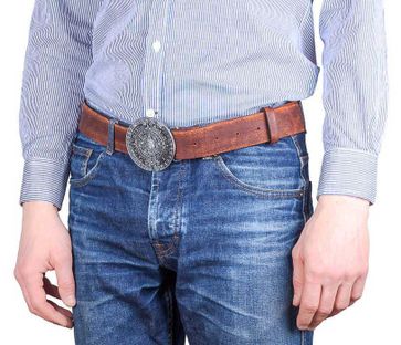 Кожаный мужской ремень "Ацтек" коричневый Выполнен из шорно-седельной кожи, отличающейся особой прочностью. Имеется круглая лаконичная пряжка. Это удачное решение для вашего совершенного образа. None Возможен самовывоз.