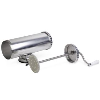 Шприц для начинения колбас — поможет Вам быстро сделать вкусную домашнюю колбасу любых видов и любой формы Шприц для начинения колбас. Материал: алюминий. В комплект входит хажим и силиконовые насадки (15см., 19см., 22см.) Вес: 1.5 кг Особенности: