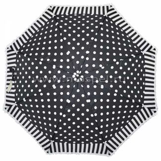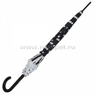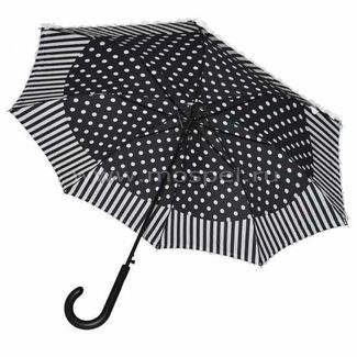 Женский зонт-трость Ferre Milano LA5006-3. Очень красивая расцветка - на черном куполе разбросаны крупные белые горохи, по краю полосатая окантовка и кружево. Открывается зонт нажатием на кнопку, а закрывается в ручную. Каркас из высококачественной стали и фибергласса. Ручка крюк. Все зонты Итальянского бренда Ferre Milano - безупречный стиль и неизменное качество. None Возможен самовывоз.