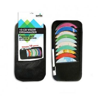 Карман для дисков CD/DVD Visor Organaizer SAPFIRE Карман-органайзер не занимает много места, он крепиться на солнцезащитный козырек внутри салона. Вмещает 10 CD/DVD дисков. Обвеспечивает удобное и функциональное хранение. Мягкий материал не повреждает рабочую поверхность дисков. Дополнительный кармашек позволяет хранить перед глазами разнообразные мелочи. None