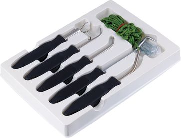 Комплект набора: Инструмент для установки шнура - 1 шт. Инструмент со сменными насадками для монтажа большинства уплотнителей - 1 шт. Изогнутый крюк для монтажа и очистки резиновых уплотнителей - 1 шт. Прямой крюк для монтажа и очистки резиновых уплотнителей - 1 шт. Инструмент с шаровидным наконечником для очистки уплотнителей от осколков стекла - 1 шт. Инструкция - 1 шт. Картонная коробка с пластиковым ложементом - 1 шт.
