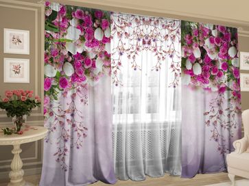 Комплект штор с тюлем Баланс цветов — красивый и практичный вариант украшения окон, который станет изюминкой интерьера. Яркий цветочный принт привнесет свежие летние нотки в обстановку и подарит прекрасное настроение.<br>