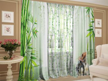 Комплект штор с тюлем Бамбуковые заросли — сочетание практичности и оригинального дизайна, благодаря которому привычная обстановка заиграет новыми красками. Набор с сочными оттенками свежей зелени создаст в комнате неповторимую атмосферу.<br>
