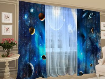 Комплект штор с тюлем Виртуальная реальность станет ярким акцентом в любом интерьере. Космическая тематика придется по вкусу ценителям неординарных решений в декорировании обстановки. Материалы, из которых изготовлен набор, не выцветают под воздействием ультрафиолета, а изображение не теряет первозданной яркости.<br>