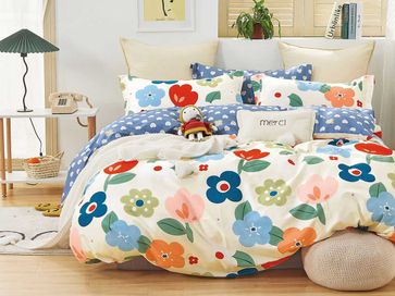 Комплект постельного белья Мультяшная поляна создаст сказочную атмосферу в комнате. Рисунок на пододеяльнике можно поворачивать цветочной стороной или принтом с облаками под настроение. Мягкий натуральный материал подарит сладкий сон.<br>