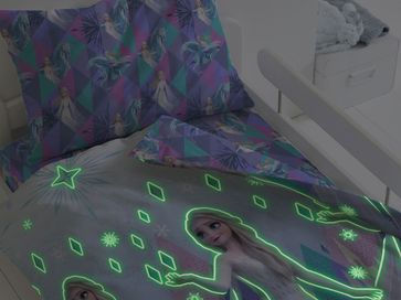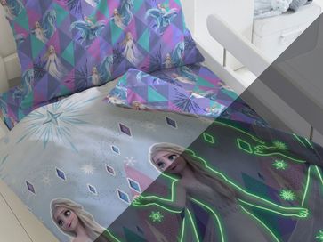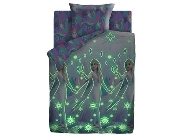 Комплект постельного белья Магия Эльзы станет украшением спального места и перенесет ребенка в сказочную атмосферу благодаря светящемуся в темноте неоновому рисунку. Нежная ткань прекрасно пропускает воздух, впитывает лишнюю влагу и сохраняет яркий цвет.<br>