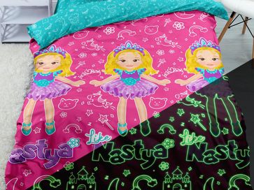 Детский комплект постельного белья Настя Глоу Найт порадует ребенка красочным принтом со светящимися в темноте элементами на тему популярного видеоблога. Высококачественный экологичный материал гипоаллергенен, приятен телу, характеризуется высокими износостойкостью и воздухопроницаемостью.<br>