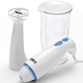 Блендер ручной ZM (х12). Тип: погружной. Материал корпуса/чаши: ABS-пластик. Нож: нержавеющая сталь. Цвет: белый, голубой. Мощность:175-200 Вт. Напряжение: 220-240 В/50 Гц. Количество скоростей: 2. Емкость мерной чаши: 700 мл. Размер упаковки: 17 х 11 х 21,5 см. Упаковка: коробка. Вес: 1 кг. Страна производитель: Китай. Ручной погружной блендер ZIMBER – это незаменимый кухонный прибор, который дарит многообразие возможностей при измельчении и смешивании самых разнообразных продуктов. Приготовить фирменный суп-пюре, измельчить лук или зелень для салатов или приготовить коктейль - со всем этим без труда справится этот маленький кухонный помощник. Прибор отличается элегантным современным дизайном и высокими техническими характеристиками. Лезвия ножа выполнены из высококачественной нержавеющей стали, отличающейся прекрасными режущими и износостойкими качествами, прочностью и долговечностью. Блендер ZIMBER функционален и прост в использовании, легко разбирается и чистится. Аксессуары: нож, чаша для вымешивания. С блендером ZIMBER многообразие рецептов блюд ограничено только Вашими кулинарными фантазиями! None