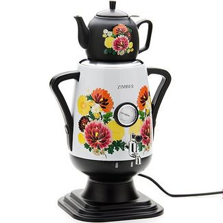 Самовар+заварочный чайник ZM (х4). Самовар: пластик, нержавеющая сталь. Цвет: белый, черный. Рисунок: желтые/красные/оранжевые цветы. Ручки: пластик. Заварочный чайник: керамика. Цвет: черный. Рисунок: желтые/красные/оранжевые цветы. Объем чайника: 800 мл. Объем самовара: 3,2 л. Мощность: 1850-2300 Вт. Напряжение: 220-240 В, 50-60 Гц. Индикатор включения: есть. Индикатор кипения: есть. Индикатор поддержания температуры. Термометр: есть. Размер коробки: 26,5 х 26,5 х 37 см. Вес: 2,3 кг. Страна производитель: Китай. Электрический самовар ZIMBER выполнен из стали и термопластика, прекрасно сохраняющего тепло, поэтому вода в самоваре остается горячей более 2-х часов. Самовар оснащен скрытым нагревательным элементом из нержавеющей стали, индикатором кипения и поддержания температуры, а также термометром. В набор входит черный керамический заварочный чайник, украшенный изображением цветов, со съемным фильтром из нержавеющей стали. Такой самовар можно использовать круглый год, он украсит Ваш стол, а чай из такого самовара будет особенный. Красочный самовар ZIMBER с ручной художественной росписью в русском стиле, станет замечательным подарком к любому празднику! None