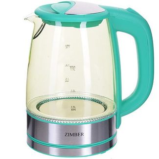 Корпус электрического чайника ZIMBER выполнен из высококачественного термостойкого стекла, сохраняющего природные свойства воды и цветного термостойкого пластика. Благодаря большой мощности чайник за считанные минуты вскипятит воду. Прозрачный корпус со шкалой контроля уровня воды и внутренней подсветкой, позволяет следить за процессом нагрева. Чайник соединен с базой центральным контактом и легко вращается на 360 градусов. Крышка чайника открывается автоматически от легкого нажатия на кнопку. Нагревательный элемент чайника встроен в плоское дно и надежно защищен стальной пластиной, что делает его чистку максимально удобной. Среди характеристик безопасности использования чайника стоит отметить автоматический и ручной выключатель, а также защиту от перегрева. None