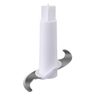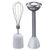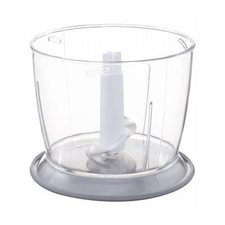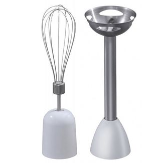 ручки блендера с мотором мощностью в 400 Вт;- погружной насадки, основная часть которой выполнена из нержавеющей стали, что позволяет перебивать продукты даже в процессе готовки, а высокопрочные ножи позволяют перебить даже твердые и вязки продукты; металлического венчика; чаши измельчителя объемом 600 мл и плотно закрывающейся крышкой, что позволяет хранить в ней продукты в холодильнике; ножи также выполнены из стали класса 304 – нержавеющий металл высокой износостойкости; и мерного стакана объемом на 700 мл, выполненного из прозрачного пластика с нанесенной маркировкой в мл.