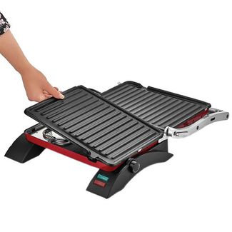 Дизайн электрогриля SINBO SSM 2529 значительно отличается от других моделей данной линейки товаров для дома. Разработчики сохранили только металлический корпус, в данной модели красного цвета, и ручку, расположенную сверху крышки, которая не соприкасается с ней и имеет теплоизоляционное покрытие, что предотвращает нагревание даже при длительном использовании. Хотя вряд ли у вас данная модель будет находиться долгое время во включенном состоянии. Этот электрогриль оснащен специальной функцией быстрого нагрева, что позволяет экономить электроэнергию, а благодаря большой мощности нагревательных элементов в 2000 Вт, продукты будут прожариваться не только быстро, но и равномерно. Лоток для сбора сока и жира расположился в задней части корпуса, а поворотный переключатель, позволяющий отрегулировать мощность работы прибора, установлен в верхней части правой ножки. На крышку корпуса нанесена маркировка с видами продуктов и информацией, на каком режиме какой продукт лучше прожаривать. Индикаторы «включения» и «готовности работы» (сигнализирует о том, что электрогриль уже достаточно прогрелся на заданную мощность) также расположились на правой ножке прибора. В модели электрогриля SINBO SSM 2529 установлен тип нагревательного элемента - ТЭН. Питание осуществляется от сети переменного тока 220 Вт с помощью шнура, который закреплен в задней части корпуса. Пластины съемные и имеют антипригарное покрытие, что позволяет жарить продукты без масла, при этом не переживая, что они пригорят или пристанут. Размер рабочей поверхности составляет 23- 30 см. Крышка с пластинами раскрывается на 180 градусов. Еще, для комфортной эксплуатации, пластины разрешено мыть в посудомоечной машине. В том случае, если толщина мяса или другого продукта не позволяет закрыть крышку электрогриля, в конструкции предусмотрена регулировка положения пластин, которая позволяет приподнять их на определенную высоту и правильно расположить стейк Технические характеристики: