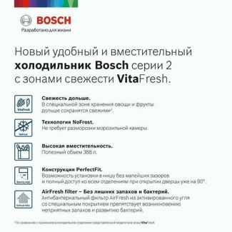 Serie 2, VitaFresh, Full NoFrost, Габариты 203x60x66, Общий полезный объем: 388 (х:280, м:108), Под нерж. сталь, Электронное управление, Утопленные вертикальные ручки во всю высоту,Multi Airflow, Режимы «Суперохлаждение», «Суперзамораживание», сигнал открытой дверцы, Конструкция PerfectFit, Зона свежести VitaFresh, Верхнее LED освещение, AirFresh Filter, Класс энергоэффективности A+, Уровень шума 39 дБ, 10 лет гарантии на компрессор, Россия None Возможен самовывоз.