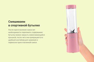 Преимуществами блендера являются привлекательный спортивный стиль и удобство в использовании, компактные размеры при большой мощности, съемная бутылка, которую вместе с приготовленным напитком можно забрать с собой в дорогу. Благодаря надежной крышке, можно не беспокоиться о том, что напиток разольется в сумке или в автомобиле. Бутылка легко устанавливается в подстаканник автомобиля.