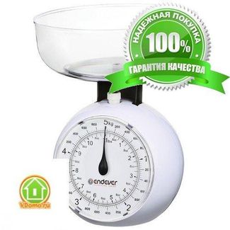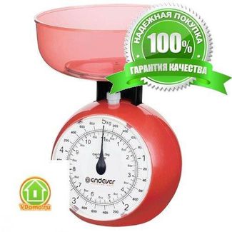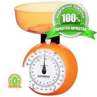 - Кухонные механические весы Endever. Максимальный вес 5 кг, цена деления 40 г, оранжевые по выгодной цене 950 р. руб.;