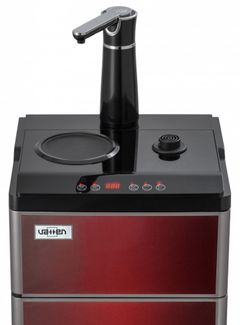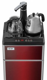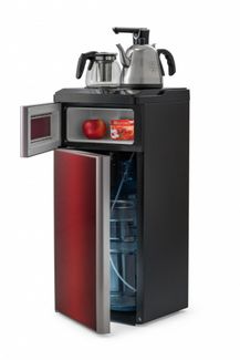 Кулер с чайным столиком Подача воды осуществляется через кран, установленный в верхней части аппарата Кулер оснащен двумя чайниками: для заварки чая и для кипячения воды. Чайник для заварки имеет свое ложе для подогрева и поддержания температуры. В чайнике для кипячения вода начинает нагреваться после двойного нажатия на кнопку горячей воды. Нагрев отключается при достижении 100 °С. Встроенный дисплей отображает текущую температуру воды. Если вода в чайнике остыла, можно включить нагрев соответствующей кнопкой. Холодная вода подается из того же крана с помощью специальной кнопки. Шкафчик для хранения посуды и продуктов находиться под верхней панелью. Бутыль устанавливается в нижний шкафчик. None