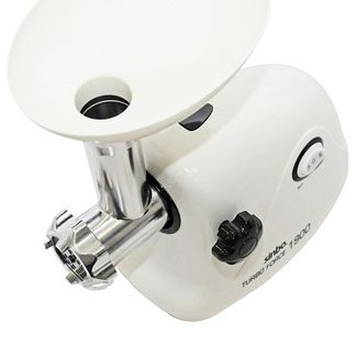 Электрическая мясорубка SINBO SHB 3160 прекрасно дополнит ассортимент ваших кухонных приборов, а часть из них даже полностью компенсирует. Небольшие габариты вмещают в себя достаточно мощный мотор на 1900 Вт, что позволяет переработать 2 кг продуктов в минуту, а легкий вес прибора, достигнут за счет материала корпуса – пластика и комплектующих, сделанных из алюминия. Модель выполнена в белом цвете с черными вставками и имеет классические формы, что позволяет с легкостью вписаться в интерьер любого дома, а высокое качество сборки обязательно порадует пользователей, учитывая доступную стоимость прибора. Максимальное время работы мясорубки без перерыва составляет 7 минут. Для защиты мотора от перегрева предусмотрена функция выключения, но также, на нижней части корпуса расположились отверстия, выводящие горячий воздух. Там же находятся и прорезиненные ножки, которые предотвращают скольжение прибора в процессе эксплуатации. На боковой части корпуса установлена кнопка-переключатель, с режимами «включить», «выключить» и «реверс». Функция реверса предусмотрена для запуска шнека мясорубки в обратную сторону, благодаря данной функции можно с легкостью протолкнуть застрявшие продукты и продолжить работу. С той же стороны корпуса расположилась и ручка разблокировки приемника. Питание мотора осуществляется от несъемного кабеля, подключающего прибор к сети 220 В переменного тока. Технические характеристики:
