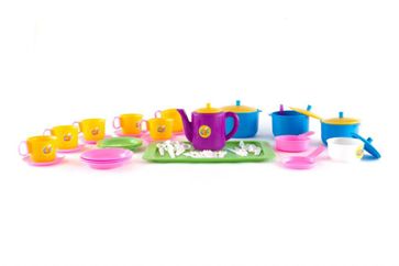 Набор посуды "Позови гостей" сразу обращает на себя внимание, благодаря ярким цветам. Он тщательно упакован в сумку. В него входит большое количество различных предметов, что позволяет не только накормить своих куколок, но и пригласить на ужин других. Игра с этим набором научит вашу доченьку гостеприимству и этикету. В комплекте Кастрюля 3 шт. Крышка кастрюли 3 шт. Сковорода 2 шт. Тарелка глубокая 3 шт. Тарелка мелкая 3 шт. Ложка 6 шт. Вилка 6 шт. Нож 6 шт. Сахарница с крышкой 1 шт. Блюдце 6 шт. Чашка 6 шт. Чайник с крышкой 1 шт. Половник 1 шт. Поднос 1 шт. None
