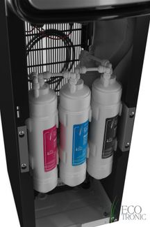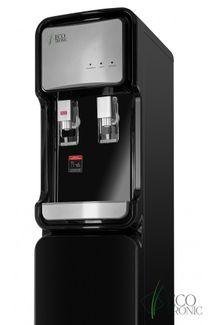 Краны "нажим кружкой" Кран горячей воды с защитой от детей Большой бак горячей воды 5 л. Бак холодной воды 4 л, позволяет использовать лампу UV (опция) для постоянной дезинфекции фильтрованной воды Цвет: черный с серебряной вставкой Производство: Корея. None
