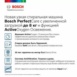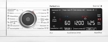 Стиральная машина PerfectCare класса Премиум с увеличенной загрузкой 8 кг, инновационным барабаном SoftCare Drum и технологией ActiveOxygen Освежение. Барабан SoftCare drum: Бережная стирка даже самых деликатных тканей. ActiveOxygen Освежение: эффективное удаление запахов без стирки с применением активного кислорода AquaStop: 100% гарантия от протечек в течение всего срока службы. Система AntiVibration: тишина в доме. PerfectFit: установка стиральной машины вплотную к стене или мебели. Цвет: белый. Максимальная загрузка: 8 кг. Макс. скорость отжима 1200 об/мин. Скорость отжима 1200 об/мин до 400 об/мин. Технология ActiveOxygene: использование молекул активного кислорода (озона O3) для обработки белья. Класс стирки A / Класс отжима B. Размеры (В х Ш х Г): 84.8 x 59.8 x 49.6 см. None Возможен самовывоз.