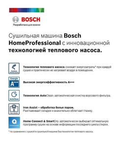 Сушильная машина HomeProfessional с классом энергоэффективности А+++, технологиями AutoClean, Iron Assist и интеллектуальной функцией Smart Dry - инновационное решение в бережном уходе за одеждой. Технология теплового насоса: снижает энергозатраты при каждой сушке и практически не нагревает воздух в помещении. Технология AutoClean: позволяет реже очищать машину от ворса без потери эффективности сушки. Iron Assist: программа обработки белья паром способствует разглаживанию складок на белье и поможет избежать глажки. Голосовое управление с Марусей от VK: удобная настройка, выбор и включение программ голосом. Smart Dry: автоматически выбирает оптимальную программу сушки на основе информации последнего цикла стирки. Сушка по типу воздушной конденсации. Максимальная загрузка: 9 кг. Класc энергоэффективности: A+++. Уровень шума: 62 дБ. Размеры (В х Ш х Г): 84.2 x 59.8 x 61.3 см. None Возможен самовывоз.
