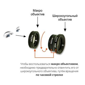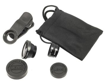Зажим; Фишай объектив; Макро объектив; Широкоугольный объектив; Стильный бархатный мешочек для набора.