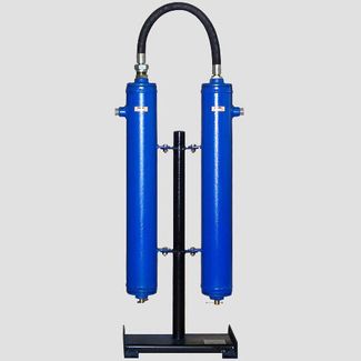 Фильтрационный модуль (ФМ) предназначен для тонкой очистки сжатого воздуха и различных газов от аэрозолей масла и влаги, а также от твердых частиц размером менее 1 мкм. Обеспечиваемое остаточное содержание аэрозоля масла - менее 0,1 мг/м3. Используется в системах пневмоуправления и автоматики, пневмоприводе устройств и инструмента для окраски поверхностей распылением. ФМ состоит их двух последовательно установленных фильтров с фильтроэлементами на основе ультратонкого стекловолокна без связующего. Первый по ходу газа фильтр предназначен для отделения механических примесей и крупных капель масла и влаги, а также для укрупнения оставшегося в потоке тонкодисперсного аэрозоля. Второй по ходу газа фильтр служит для окончательной очистки газа от примесей. Сжатый воздух поступает в фильтр через боковой патрубок модуля грубой очистки, проходит фильтрующие стекловолокнистые слои фильтроэлементов грубой и тонкой очистки и выходит из фильтра через боковой патрубок модуля тонкой очистки. Оба фильтра работают в режиме самоочищения от жидких примесей. Отделившаяся жидкость собирается в нижней части корпуса и периодически выводится через сливные штуцера, при открытии установленных на них запорных вентилей.