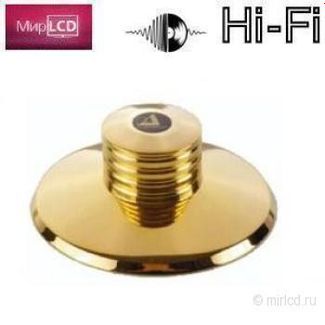 Прижим для виниловой пластинки. Прижим (клемп) для проигрывателя винила. Массивный клемп из нержавеющей стали с гальваническим покрытием из золота. Предназначен для всех поворотных тонармов. Вес 375 грамм. Производитель: Германия. None