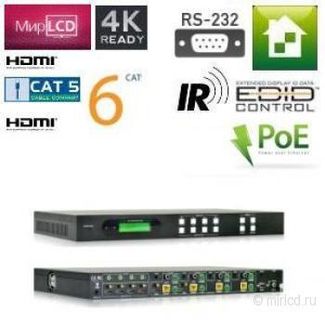 Матричный коммутатор HDMI 4 х 4. Матричный коммутатор 4 HDMI x 2 HDMI - 4 HDBT для передачи сигналов по одному кабелю витой пары CAT5e/6/7 c IR и RS232управлением. Высококачественный матричный коммутатор 4 x 4 для преобразования сигналов HDMI в HDBT и может передавать его по кабелю на витой паре на расстояние до 70 метров. Он позволяет соединить любой из входов с любыми выходами или со всем выходам сразу. Прибор выполняет компенсацию АЧХ кабеля и перетактирование сигнала. Модель имеет расширенные фвозможности управления и осуществления предварительного просмотра контента. Разрешение макс 4Kx2K, 1080P 3D. EDID встроен. Управление кнопки, 5 х RS232, IR. Передача сигнала до 40 м (4K); до 70 м (1080P) по CAT 5e/6. Передача данных 10.2 Гбит/с. Совместимость HDCP 2.2. Дополнительно 4 х 3p небалансный стерео выход; PoC. None