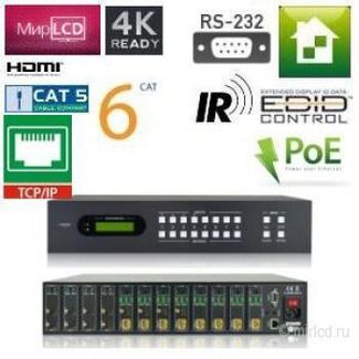 Матричный коммутатор HDMI 8 х 8. Матричный коммутатор 8 HDMI x 8 HDMI - HDBT для передачи сигналов по одному кабелю витой пары CAT5e/6/7 c IR, RS232 и TCP/IP управлением. Высококачественный матричный коммутатор 8x8 для преобразования сигналов HDMI в HDBT и может передавать его по кабелю на витой паре на расстояние до 70 метров. Он позволяет соединить любой из входов с любыми выходами или со всем выходам сразу. Прибор выполняет компенсацию АЧХ кабеля и перетактирование сигнала. Модель имеет расширенные фвозможности управления и осуществления предварительного просмотра контента. Разрешение макс 4Kx2K, 1080P 3D. EDID встроен. Управление кнопки, x9 RS232, IR, TCP/IP. Передача сигнала до 40 м (4K); до 70 м (1080P) по CAT 5e/6. Передача данных 10.2 Гбит/с. Совместимость HDCP 2.2. Дополнительно 8 х 3p небалансный стерео выход; PoC. None