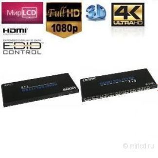 Усилитель-распределитель HDMI 1 х 8. Усилитель-распределитель HDMI 1 х 8 c поддержкой 3D, 4K и управлением EDID. HDMI 2.0 и HDCP 2.2, поддерживает разрешения вплоть до Ultra HD 4К на частоте 30/50/60 Гц (2160p), которое в 4 раза лучше изображения в формате Full HD 1080p/60. Автоматическое переключение источников. Обратная совместимость с предыдущими стандартами HDMI 1.3 и 1.4. Поддержка 3D с разрешением до 1080p. Поддержка всех видов источников HD сигнала, в том числе кабельных, эфирных и спутниковых ресиверов, игровых консолей PS3/PS4/ХBох, Blu-ray и DVD плееров, Amazon Fire TV, Chromecast, Apple TV, систем видеофиксации (видеорегистраторы), компьютеров, ноутбук и т. д. Простая установка, которая сводится лишь к подключению кабелей. Ручной выбор режимов EDID. 8-и портовый HDMI сплиттер Dr.HD с поддержкой HDMI 2.0! Этот делитель в компактном металлическом корпусе из модельного ряда конца 2015 года. Он собрал в себе все самые передовые разработки компании Dr.HD. Поддержка HDMI 2.0, Ultra HD 4K at 30/50/60Hz (2160p), 3D, HDCP 2.2, LPCM 7.1CH, Dolby TrueHD и DTS-HD Master Audio! Такой делитель (сплиттер) позволяет разделить сигнал с одного HD источника на 8 телевизора/монитора/панели и т.п. В данной модели, благодаря поддержки HDMI версии 2.0, Вы получите не только удобство пользования и высококачественное изображение, но и все сопутствующие самому современному стандарту функции. None