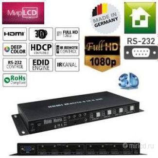 Матричный коммутатор HDMI 4 х 4. Серия Exzellenz. Матричный коммутатор HDMI 4 х 4 c поддержкой HDCP, ИК, RS-232 управлением. Матричный коммутатор HDMI с одним входом и четырьмя выходами. Каждый выход может быть маршрутизирован независимо на каждый вход. Он управляется с помощью кнопки, дистанционного управления или через интерфейс RS-232. Производитель: Германия. None