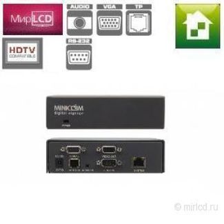 Удлинитель линии. Серия Minicom. Передатчик для передачи Minicom DS Vision 3000 VGA видеосигнала, звуковых стерео и RS-232 по одному кабелю витой пары CAT5e/6/7 (TP) с 1 выходом. Входит в семейство Minicom DS Vision 3000 (DSV3K). 1 вход VGA (разъём HD-15F) c проходным выходом, 1 вход небалансного стерео аудио линейного уровня (3.5-мм розетки "мини-джек"). 1 порт RS-232 (разъём DB-9F), поддерживает скорость обмена до 57600 бит/с, сигналы RXD, TXD, DTR, DSR, RTS, CTS, может использоваться, например, для управления устройствами, подключаемыми к приёмникам. 1 ( DSV3K-T ) или 8 ( DSV3K-B8 ) или 16 ( DSV3K-B16 ) идентичных выходов на витую пару (разъём RJ-45). Могут подключаться к приёмникам DSV3K-RL, DSV3K-RS, усилителю-распределителю DSV3K-LS. При разрешениях до 1920 х 1440, 60 Гц при использовании приёмников DSV3K-RS длина кабеля витой пары до 110 м, с приёмником DSV3K-RL — до 300 м, с этим приёмником при использовании дополнительного каскада на приборе DSV3K-LS — до 600 м. Рекомендуется кабель витой пары UTP/FTP Cat5 и выше, 24AWG с согласованными длинами проводников (Low Skew), например Kramer BC-XTP. Расхождение задержки распространения сигнала в кабеле между отдельными витыми парами не должно превышать 20 нс на 100 м. Порт CONTROL для подключения компьютера с ПО Video Service Utility (используется для настройки качества картинки в приёмниках и усилителе-распределителе). Питание 12 В. None