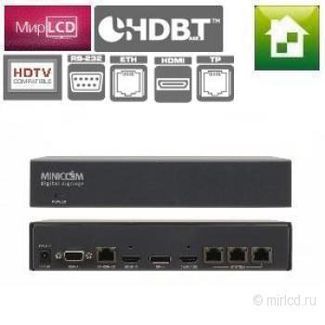 Удлинитель линии. Серия Minicom. Приемник для передачи Minicom DS Vision цифровых HDMI или DisplayPort сигналов, RS-232 и Ethernet по одному кабелю витой пары CAT5e/6/7 (TP). Входит в семейство Minicom DS Vision Digital (DSVD), построенном на технологии HD - BaseT. 1 вход HDMI, 1 вход DisplayPort. Выбор входа производится настройкой передатчика через сеть Ethernet. При выборе входа DisplayPort производится его внутреннее преобразование в сигнал HDMI для передачи на приёмник. 1 порт RS-232, 1 порт Ethernet 1000BaseT, репликация этих портов на приёмнике. 1 выход HDMI для подключения локального дисплея или для каскадирования передатчиков. 1 выход ( DSVD-T ) или 3 выхода ( DSVD-B ) на витую пару (разъёмы RJ-45). Между передатчиком и приёмником используется кабель витой пары STP/FTP категории 5 и выше, длина до 100 м. Скорость передачи данных HDMI до 10.2 Гбит/с (3.4 Гбит/с на канал). Питание 12 В, 2 А. None