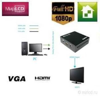 Коммутатор-масштабатор аудио-видео VGA - HDMI. Комутатор-масштабатор аудио-видео VGA и аудио (правый и левый) на HDMI. Масштабирует VGA до HDMI 720p или 1080p. Вход 1 x VGA, 1 х стерео Jack 3.5 мм. Выход 1 x HDMI. Разрешение вход VGA: VGA: VGA, XGA, SXGA, SVGA. Разрешение выход HDMI: 720p/60Hz, 1080p/60Hz. Позволяет подключать ноутбук, компьютер, проектор, DVD плеер через VGA коннектор к видео оборудованию, оснащенному HDMI разъемом. Предназначен для преобразования VGA-сигнала с сопутствующим стереофоническим аудио-сигналом в стандарт HDMI. None