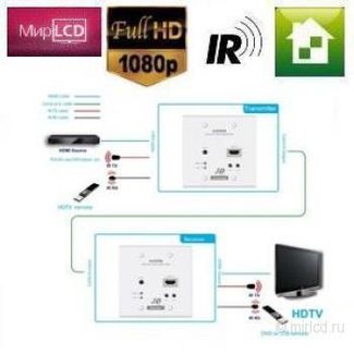 Удлинитель линии. Комплект HD-BaseT HDMI приемник-передатчик в настенном корпусе для передачи сигналов по одному кабелю витой пары CAT5e/6 с IR управлением. Позволяет удлинить сигнал на 70 м. Так же имеет IR порты через которые можно управлять телевизором или другим устройством в другой комнате. Предназначен для установки в стене помощью 1-секционной (1-gang) электрической коробки. Поддержка разрешения HD Ultra 4K х 2К. Поддержка разрешения HDMI с разрешением до 1080p с 36-битной глубиной цвета. Поддержка формата 3D. Автоматическая регулировка обратной связи, выравнивания и усиления. Поддержка разрешения HDMI с разрешением до 1080p с 12-битной глубиной цвета. Поддержка High Resolution Audio, включая DTS-HD Master Audio и Dolby True-HD. Поддержка передачи инфракрасного сигнала (IR). Используйте два кабеля UTP LAN (Cat5E/6) для замены HDMI кабеля для достижения передачи на большое расстояние, кабель UTP должен соответствовать стандарту IEEE-568B. Поддерживает HDCP. None