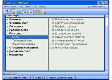 Приложение для ведения кадрового учета сотрудников предприятия. Учет организован с помощью специальных карточек личного учета, в которых отражаются сведения о работнике, текущей позиции, истории назначений и прочие многочисленные сведения. Основные данные в карточках формируются на основе приказов по персоналу. В системе используются приказы на прием, перемещение, увольнение, отпуск, командировку, поощрения или взыскания, а также приказы произвольного вида. Кроме этого, в этом приложении формируется структура предприятия и штатное расписание. Основные функции: