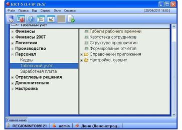 Приложение предназначено для ведения табельного учета на предприятии. Учет организован на основе табелей рабочего времени, составляемых ежемесячно по каждому подразделению и для каждого работавшего в нем сотрудника. Табель ведется подневно. Первоначально табель заполняется плановыми значениями на основе плановых графиков рабочего времени. Кроме того, в табеле автоматически учитываются все кадровые приказы, связанные с движением сотрудников, отпуском, командировкой или листом нетрудоспособности. Плановые данные в табеле могут быть изменены вручную. По окончанию периода табели закрываются, а суммированные данные передаются в подсистему учета заработной платы. Данные прошедших периодов могут быть изменены в текущем периоде с помощью специальных сторно-табелей. Основные функции: