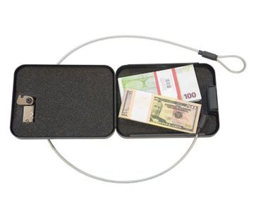 прочная стальная конструкция; замком с трехзначным тумблером и внутренней частью покрытая поролоном; стальной трос безопасности - закрепите трос вокруг закрепленного объекта и поместите конец троса в специальный паз на боковой поверхности сейфа, закройте и заблокируйте сейф, чтобы обеспечить вашим ценностям надежную безопасность; цвет: черный; толщина: 1,5 мм; замок: кодовый; вес: 1.1 кг. None