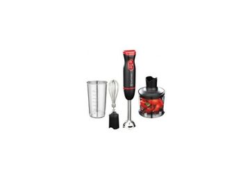 -Стильное матовое покрытие черного цвета с красными акцентами 3 в 1 -Стеклянная чаша емкостью 1,5 литра с прорезиновой крышкой -Лезвие из нержавеющей стали -2 скорости -Съемная лезвие для легкой очистки -Чаша объемом 0,7 л -Насадка для нарезки емкостью 0,5 л -Венчик -Мощность 400 Вт None