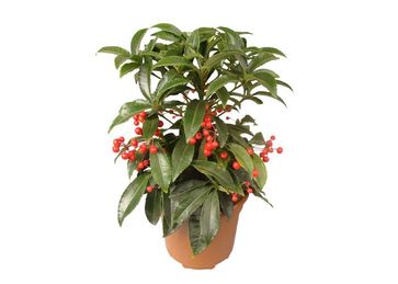 Ардизия, латинское – Ardisia. Cемейство мирсиновые. Это вечнозеленое кустовидное деревце с более или менее горизонтально отходящими ветвями. Листья 6—12 см длины, очередные, короткочерешковые, узкоэллиптические или ланцетные, на верхушке заостренные, по краю городчатые, кожистые, темно-зеленые, голые, с точечными утолщениями. Цветки в сложных щитовидных, верхушечных или пазушных поникающих соцветиях, душистые. Цветок белый с розовыми точками или розовый, пятичленный. Плоды — очень декоративные оранжево-красные округлые ягоды до 1 см в диаметре. Родина — субтропические районы Китая, п-ова Корея, Японии, Северной Индии и п-ова Малакка. Растет в лесах. В культуре известна с 1816 г. Это медленно растущее растение привлекательно своими блестящими кожистыми листьями, но основная его ценность — красные ягоды, появляющиеся в декабре. Ягоды развиваются из крошечных цветов, которые расцветают летом и остаются на растении в течение нескольких месяцев. Если растению обеспечен надлежащий уход, то оно плодоносит круглый год. Особенности содержания Местоположение: Предпочтительно светлое место, где солнце бывает только утром. Температура летом 18-20°С, зимой 16-18°С. Прекрасное многолетнее растение для умеренно теплой комнаты. Освещение: Данное растение любит яркий свет. Полив: В течение всего года почва должна быть постоянно влажной. Влажность воздуха: Влажность воздуха должна быть умеренной, не повышенной. Для того, чтобы образовались ягоды, влажность воздуха должна быть больше 60 %. Подкормка: В период роста раз в две недели, зимой – раз в четыре недели вносят обычные цветочные удобрения.Особенности: для лучшего образования ягод цветы опыляют кисточкой. Пересадка: Рекомендуется пересаживать через каждые один-два года, весной, в хорош