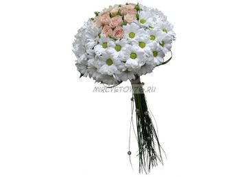 Очаровательно легкий букет, выполненный в бело розовых тонах, кустовая роза в середине - придает нежности, кустовая хризантема - легкости, а свисающий берграс - игривости. 800 Есть доставка.
